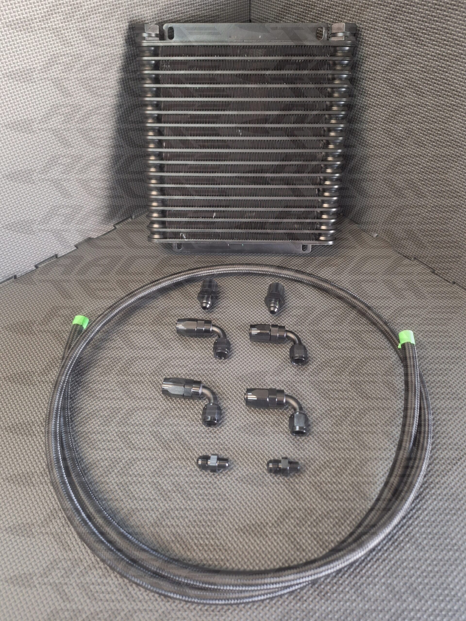 All come with 9.75 X 10.625 X 1.25 Cooler, 2 AN-6 screw in fittings, 2 transmission fittings, 4 90 degree fittings, and 20′ of black braided hose.